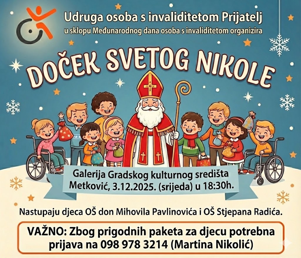 Udruga osoba s invaliditetom Prijatelj u sklopu Međunarodnog dana osoba s invaliditetom organizira Doček svetog Nikole…